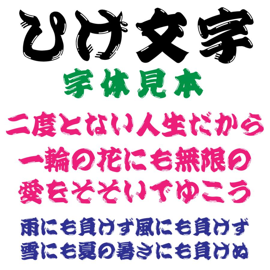 ひげ文字 は 極太の筆で勢いよく描いたような 力強い筆跡を持つ筆書体です これは1977年にモリサワ写植文字 盤用書体としてリリースされ 電算写植でも好評を得ていた ひげ文字 を復刻し デジタルフォント化したものです 筆の運びの速さゆえに生まれる墨のかすれを