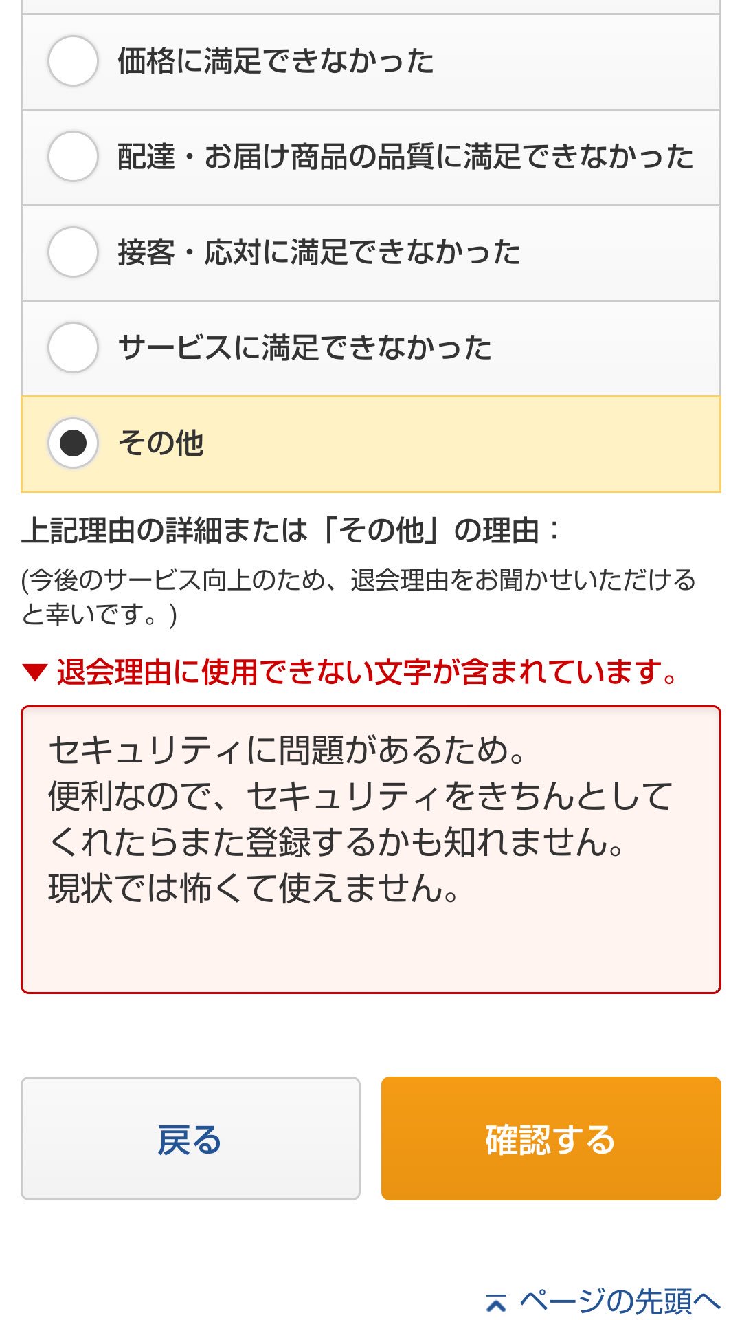 退会理由に使用できない文字